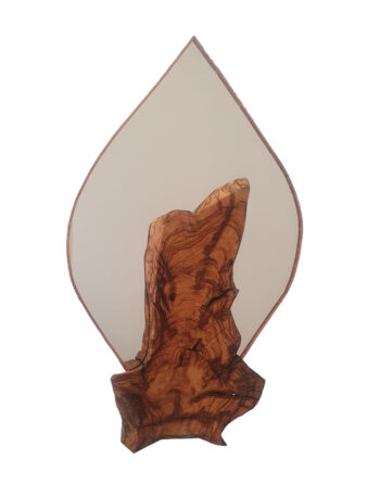 Alliance saisissante entre force naturelle et poésie visuelle, ce miroir circulaire est porté par une structure sculpturale en bois d’olivier dont la forme évoque une silhouette en mouvement ou un animal mythique prêt à bondir. Les lignes tourmentées, les textures vivantes et les contrastes entre zones claires et brûlées révèlent toute la richesse du bois. En arrière-plan, le miroir agit comme un disque lunaire, accentuant la dynamique de la composition. Véritable œuvre d’art, cette pièce incarne la liberté, la vitalité et l’unicité du matériau.