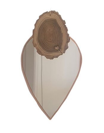 Ce miroir artisanal associe la pureté d’une forme en goutte à l’authenticité du bois naturel. Sa partie supérieure est ornée d’une véritable tranche de bois, révélant les cernes et les nuances riches de la matière brute.