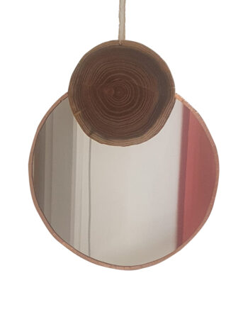 Chaque pièce est unique : le contour creusé naturellement met en valeur les contrastes entre le bois blond et son cœur plus sombre, offrant une esthétique brute et élégante à la fois. Le miroir est intégré dans la cavité centrale, créant un jeu subtil entre nature et reflet.