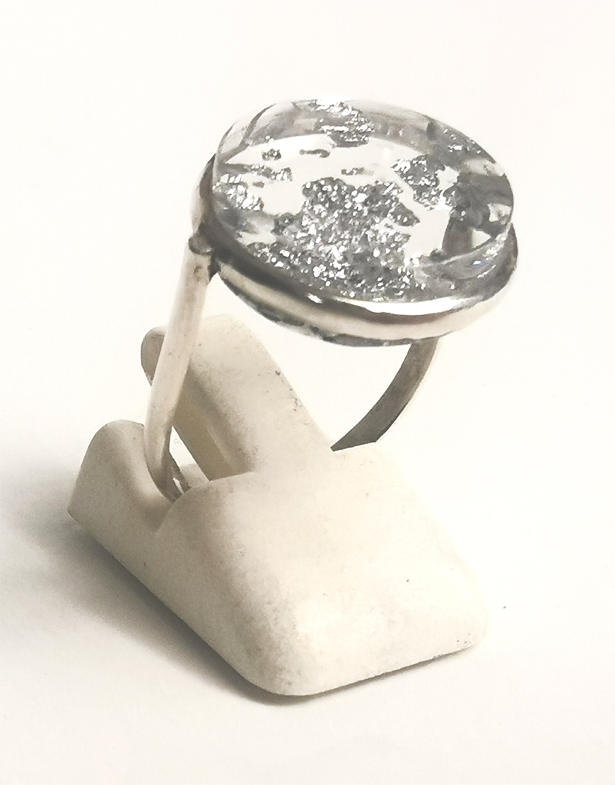 Cette bague allie modernité et délicatesse grâce à son cabochon en cristal de synthèse recyclé, au sein duquel sont incluses de fines pépites argentées. Chaque éclat semble flotter dans la matière, jouant subtilement avec la lumière pour créer un bijou à l’éclat unique.