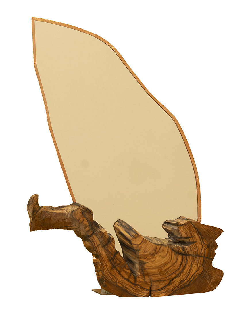 Chaque courbe et chaque veinure du bois rappellent le mouvement de la mer, tandis que la silhouette élancée du miroir évoque la voile d’un navire prêt à prendre le large.