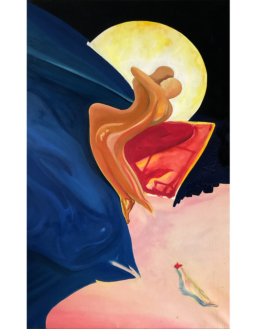 Le tableau “Crique Crac” est une œuvre envoûtante où l’artiste mêle abstraction et symbolisme pour donner vie à une scène vibrante et poétique. Dominée par des couleurs intenses et contrastées, la composition met en avant deux silhouettes orangées, fondues l’une dans l’autre, suspendues au cœur d’un cercle lumineux rappelant la lune ou un astre solaire. Leur étreinte suggère la fusion des corps et des âmes, dans un mouvement sensuel et universel.