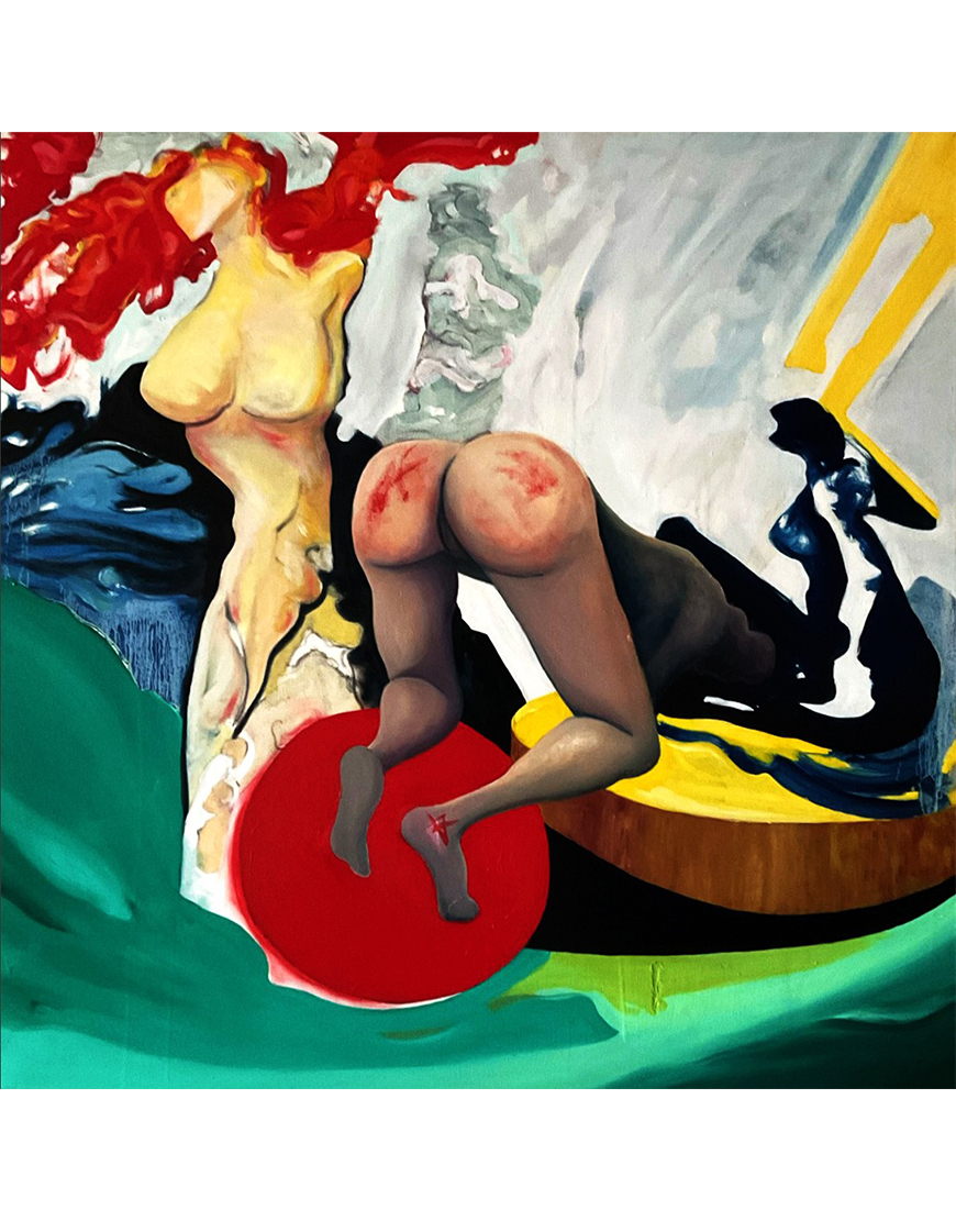 Le tableau “eXo” est une œuvre en huile sur toile où l’artiste explore la puissance du corps, la sensualité et la transgression. La composition est marquée par trois figures contrastées : à gauche, une silhouette féminine dorée aux cheveux rouges flamboyants, presque incandescents, se dresse comme une présence intemporelle. Au centre, un corps nu, tourné vers l’arrière, occupe une place dominante : ses formes rondes et charnelles traduisent une énergie brute et assumée. À droite, une silhouette sombre et mystérieuse, assise sur un cercle jaune, semble observer ou dialoguer avec les deux autres présences.