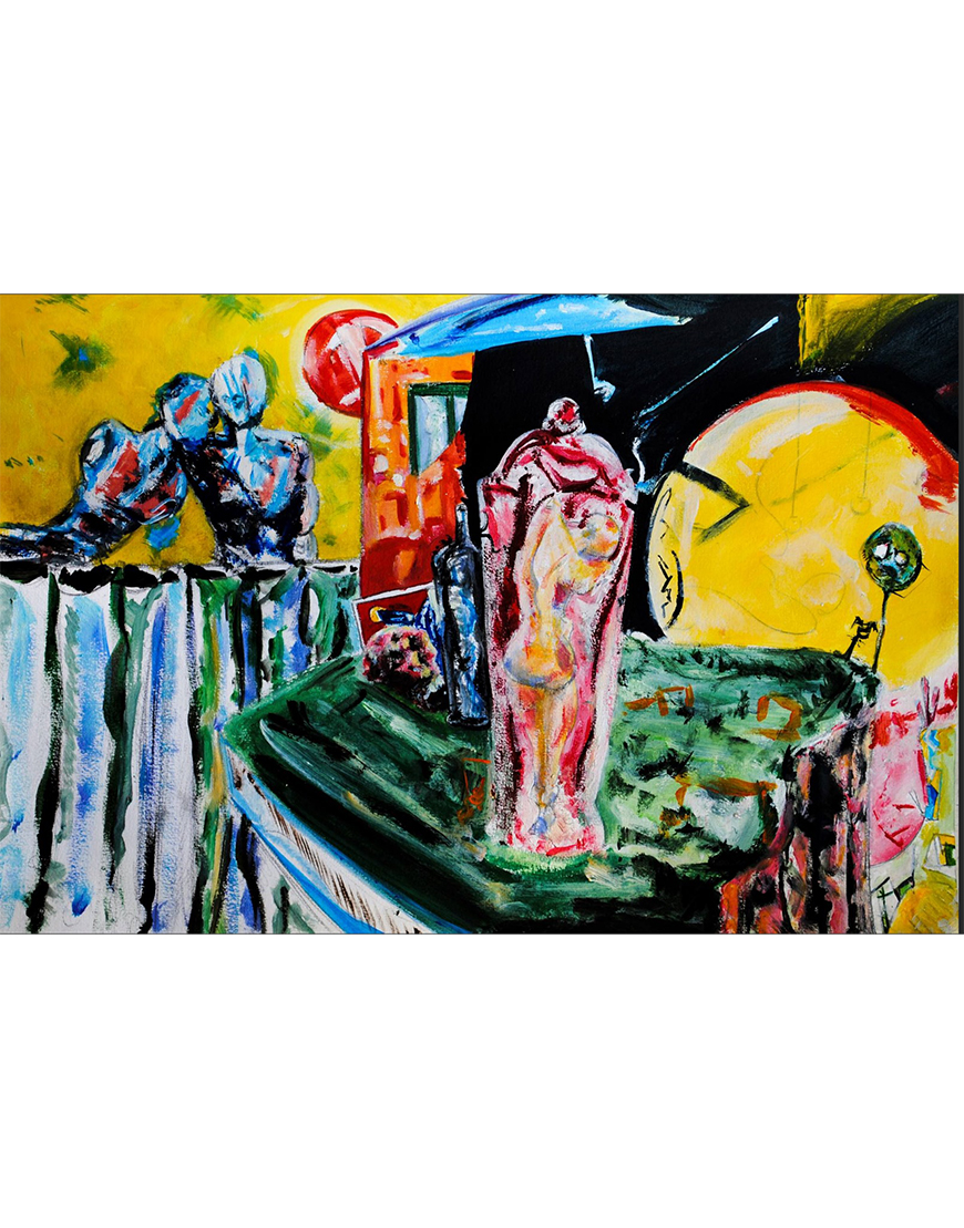 Au centre de la toile, une silhouette rouge et rosée se dresse avec force, tandis qu’à gauche deux formes bleutées semblent s’unir dans une étreinte, évoquant la tendresse et la fusion amoureuse. L’arrière-plan, dominé par des tons jaunes solaires, se ponctue de cercles lumineux rappelant des astres, renforçant la dimension symbolique et universelle de la scène.