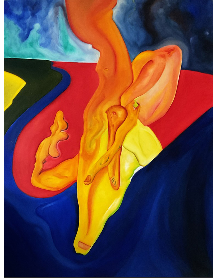 Le tableau “Triptique” est une œuvre puissante réalisée en couleurs vives et contrastées, où l’artiste explore la fusion du corps et de la matière. Au centre, une grande silhouette jaune et orangée, aux formes allongées et déformées, se déploie dans un mouvement fluide, presque en apesanteur. Le corps se métamorphose, se divise et se prolonge, donnant naissance à plusieurs figures imbriquées, comme un écho visuel au titre.